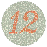 ![]() 上图,红绿色盲者中的红色盲者能读出 6 ,而绿色盲者能读出2,但红绿色弱者及正常者则两个字都能读出来。 |